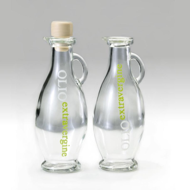 AMPOLLA PER OLIO JO CL.25 VETRO EXTRABIANCO CON IMMAGINE "OLIO EXTRA VERGINE" COMPLETA DI TAPPO FUNGHETTO SINTETICO